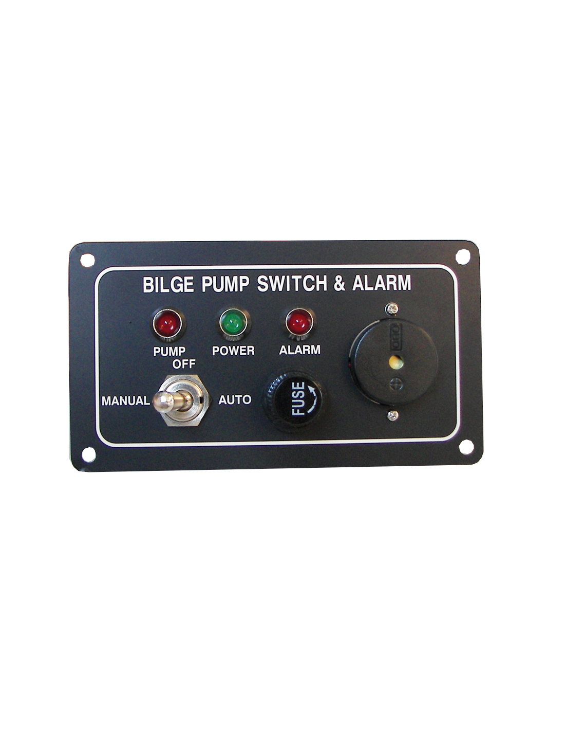 Pannello per pompe di sentina elettriche in lega leggera anodizzata. Da usare con interruttore automatico. Completo di allarme luminoso e sonoro per presenza acqua, AUTOMATICO-OFF-MANUALE con porta fusibile di sicurezza. Alimentazione 12/24V. Dimensione mm.115 x 64.