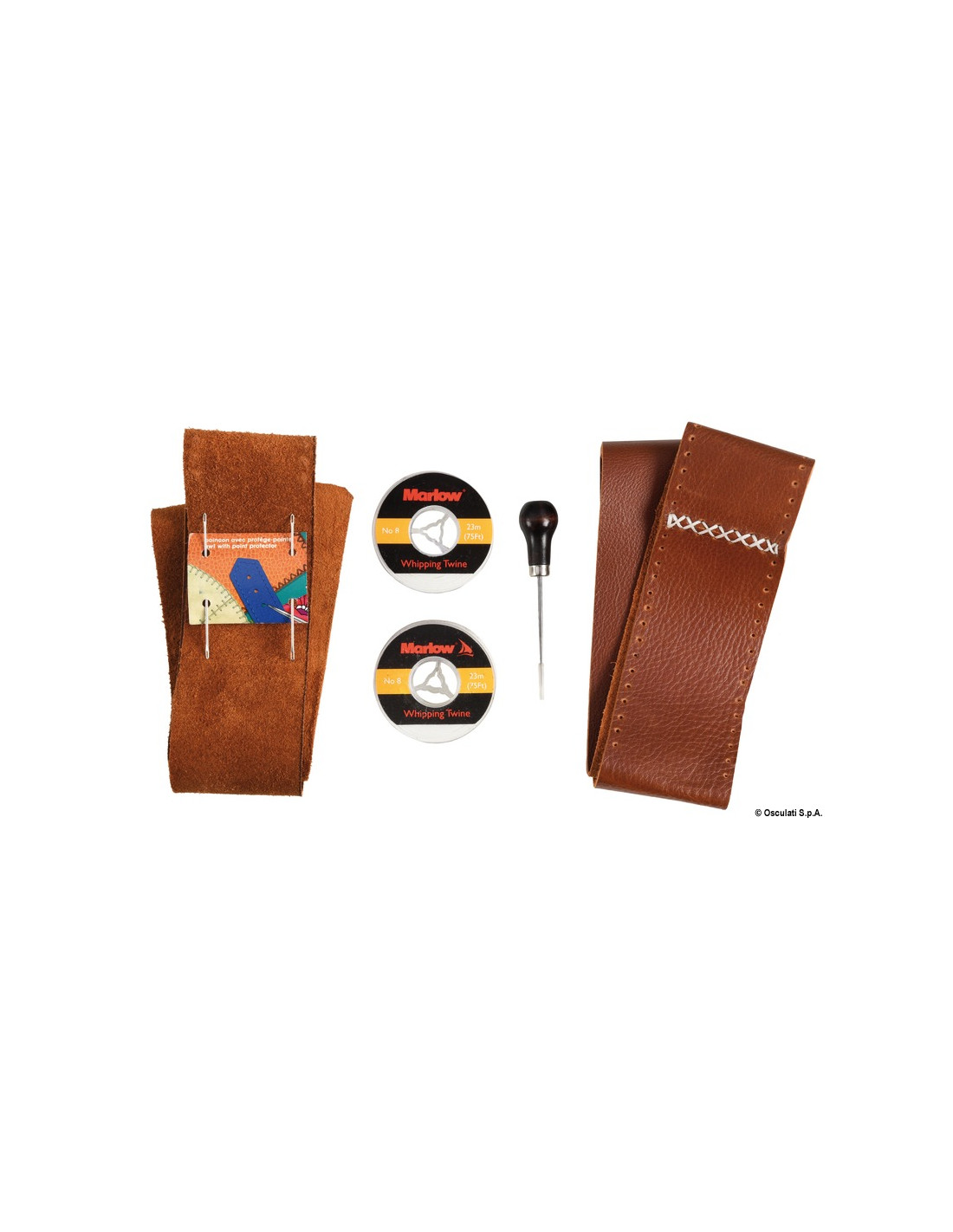 Blister espositivo contenente il necessario per ricoprire i timoni in pelle. Si può scegliere il lato da cucire per avere l'effetto liscio o scamosciato.