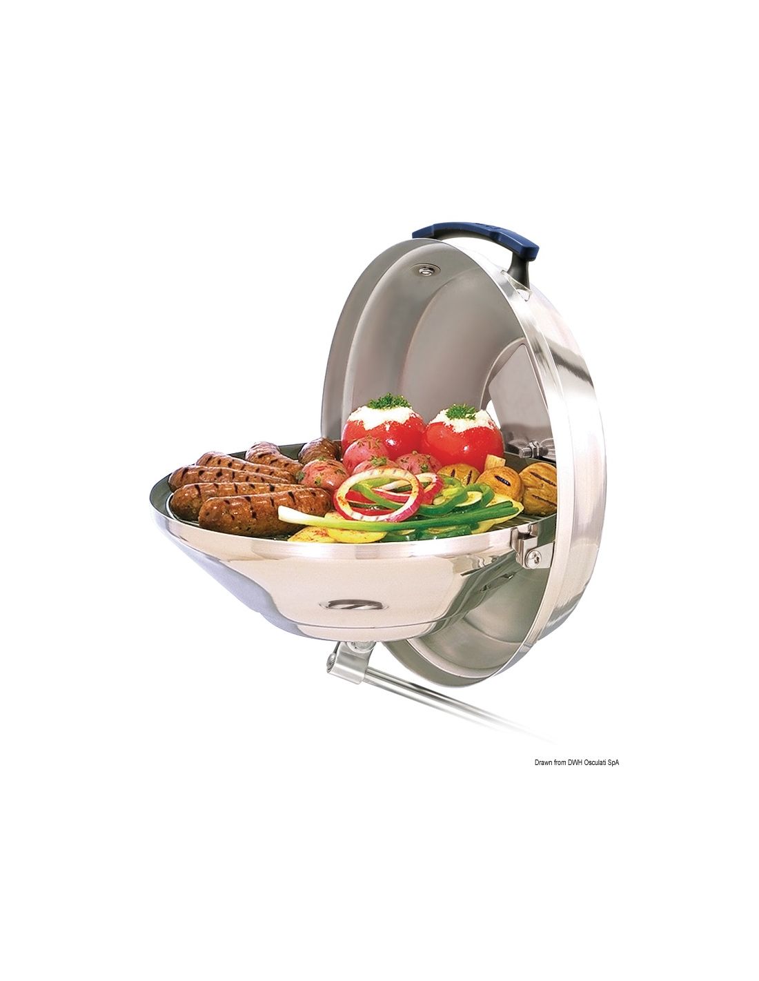 Modello in acciaio inox lucidato. Tutti i componenti sono collegati tra loro per evitare cadute in mare. Coperchio posizionabile come paravento.