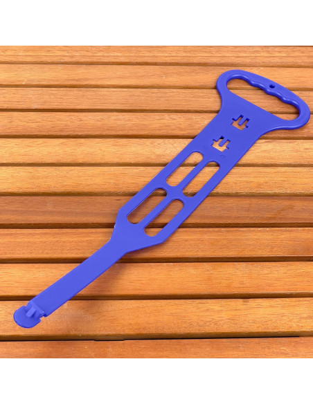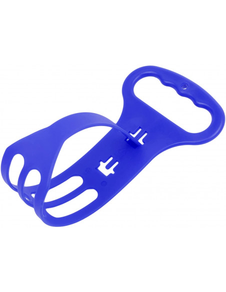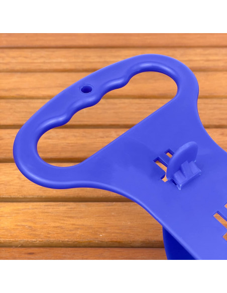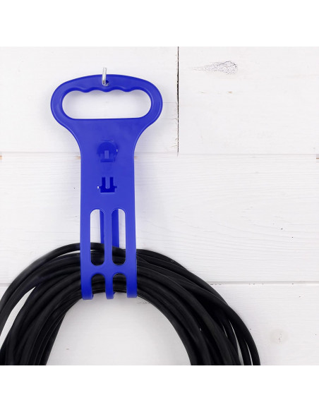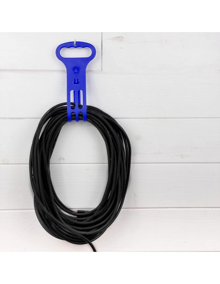 Cinghia per cavi in plastica blu dotata di comoda impugnatura ergonomica per il trasporto di tubi e corde e foro per fissaggio alla parete.