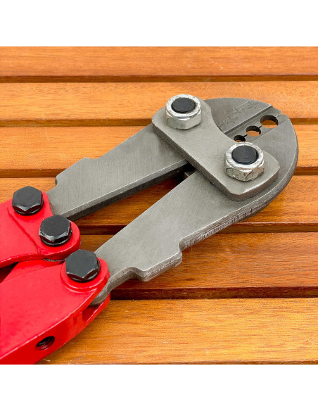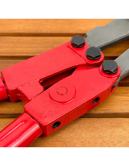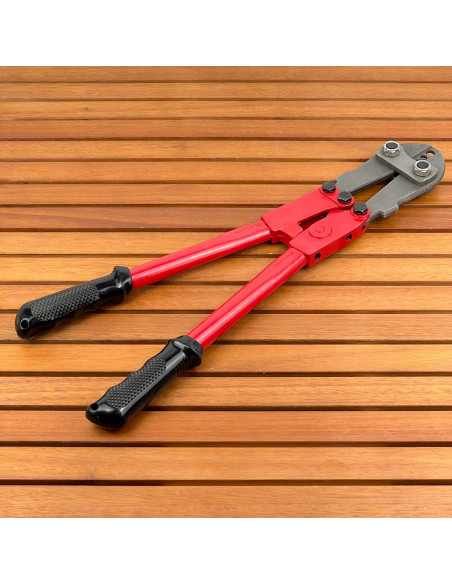 Pinza per impiombature realizzata con parte filettata in lega d’acciaio temprato, manico in acciaio trattato a caldo e impugnature in gomma.
