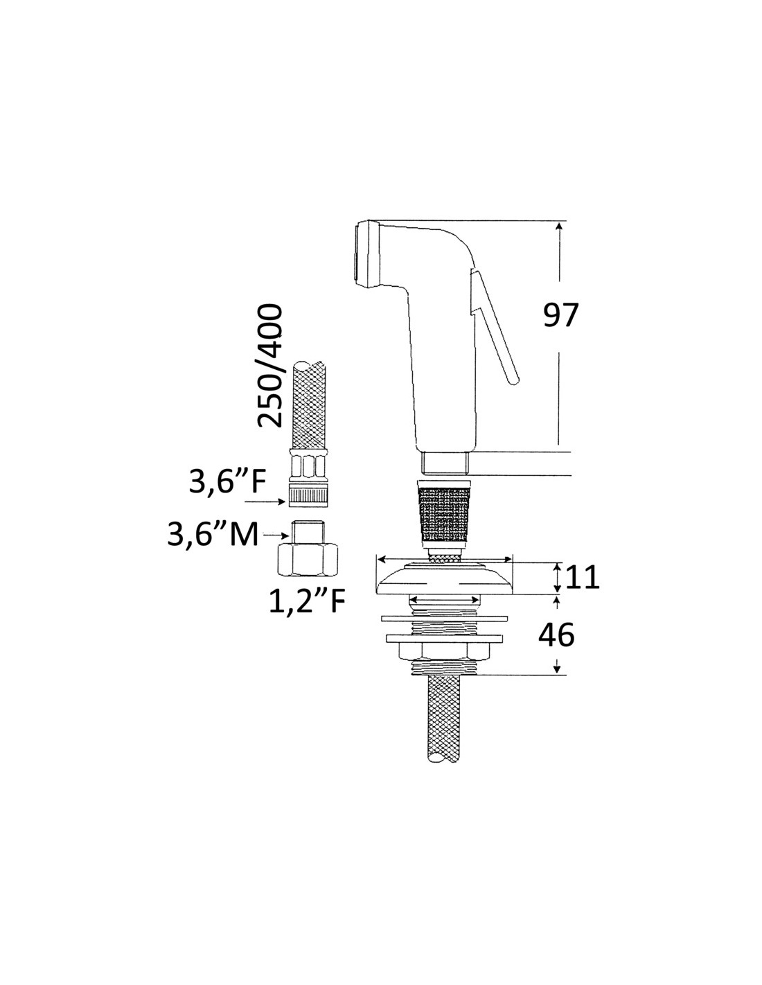 Doccia a levetta in ottone cromato e plastica, molto comoda e pratica. Premendo il pulsante, si apre direttamente il circuito idrico azionando l'autoclave. Evita un rubinetto intermedio di chiusura. Particolarmente indicata per installazioni in coperta.