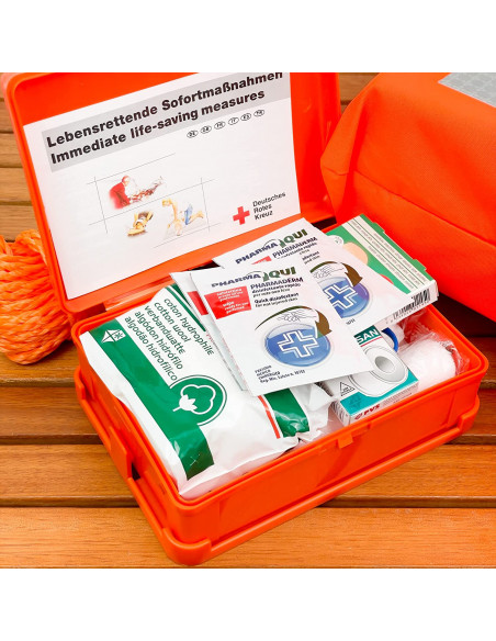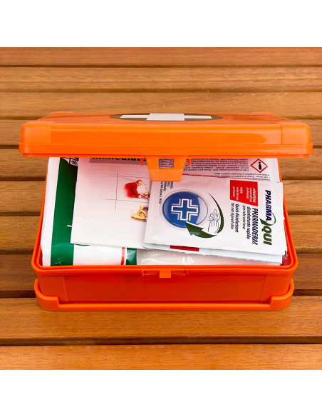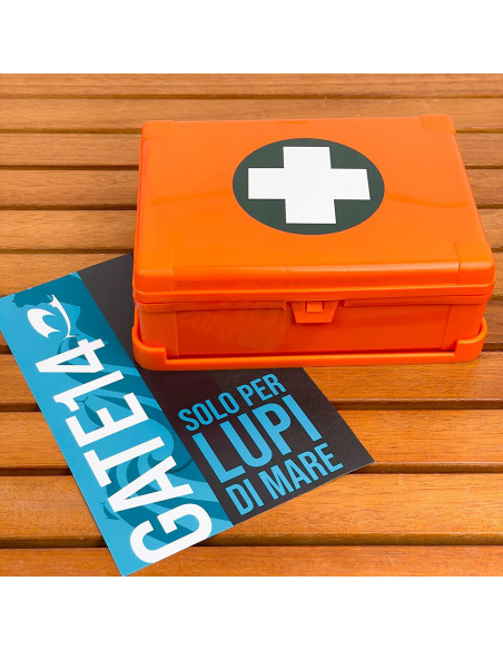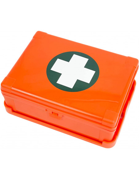 Astuccio per pronto soccorso in plastica rigida arancione con croce verde/bianca adesiva con chiusura a scatto, contiene materiale di base per gestire escoriazioni e piccole ferite.
