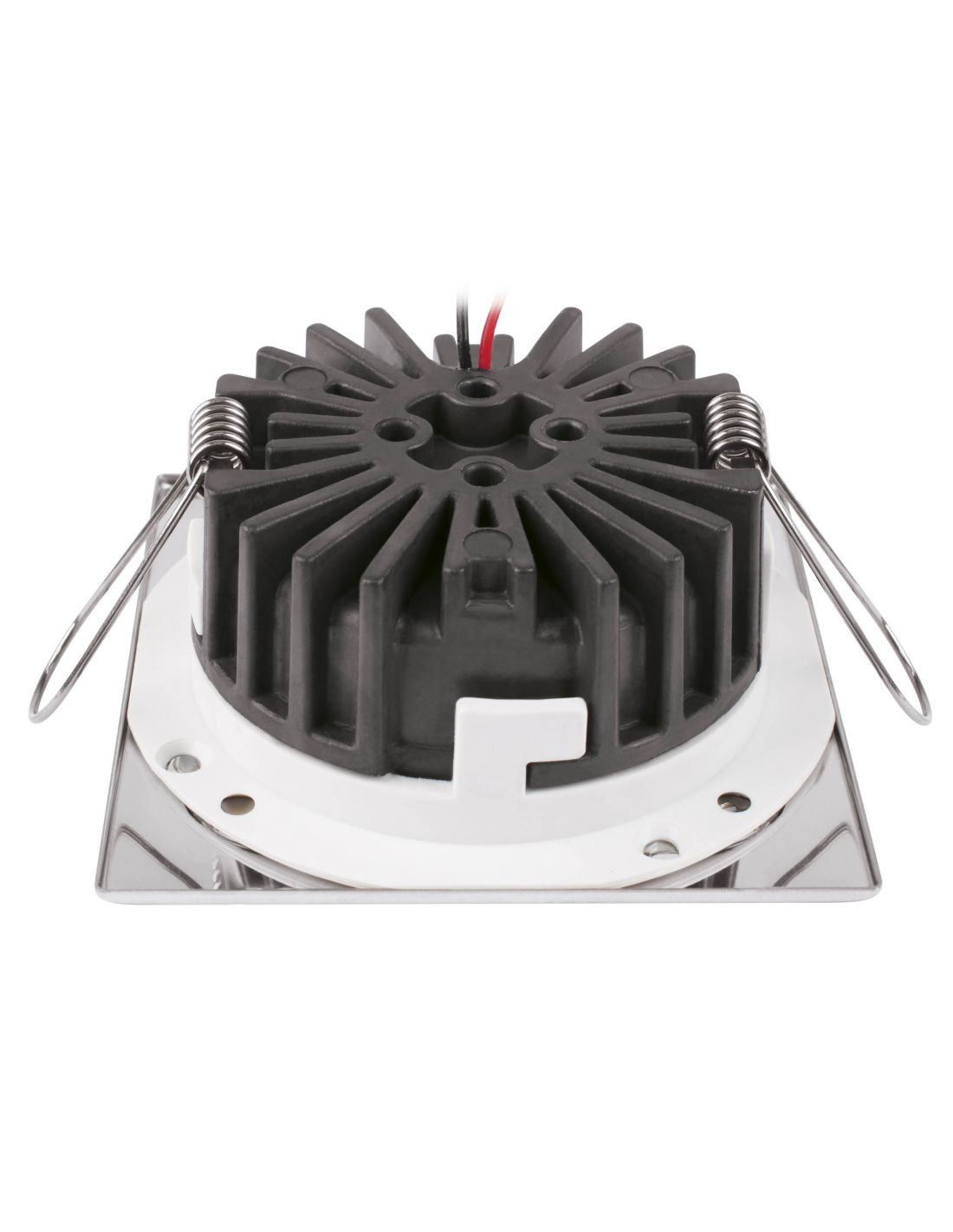 Faretto stagno IP 66, POWER LED ( 245 Lumen ) ad altissima luminosità, luce bianca calda con cornice quadrata in acciaio inox AISI 316 lucido. Sensibile alla polarità. Fissaggio con molle.