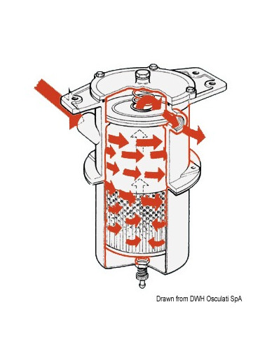 Elemento filtrante in acciaio inox. Il flusso centrifugo separa le particelle più piccole, con un'azione filtrante eccezionale. Universale per tutti i motori. Costruito con materiali a norme RINA.
