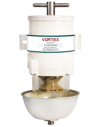 Filtri/separatori acqua-gasolio. Carcassa in alluminio, parte trasparente in tecnopolimero. Equipaggiati con vaschetta inferiore anti-fiamma. Costruiti in accordo con la norma ISO 10088.