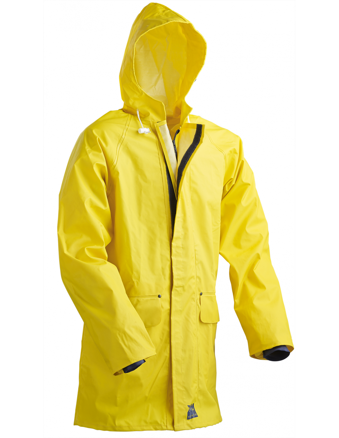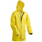 Cerata leggera ed impermiabile in poliestere giallo con spalmatura in PVC e cuciture saldate ad alta frequenza, dotata di cappuccio con coulisse e doppia chiusura (cerniera e velcro) sul davanti, ampie tasche con apertura a strappo e polsini aderenti con striscia elastica.