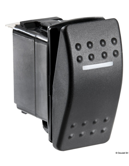 Richiedono per l’installazione un foro rettangolare da 21,5x36,8 mm. Capacità max 20 A / 12 V. Bascula rigida e spia luminosa a LED che si illumina attraverso la bascula attivando il contatto.