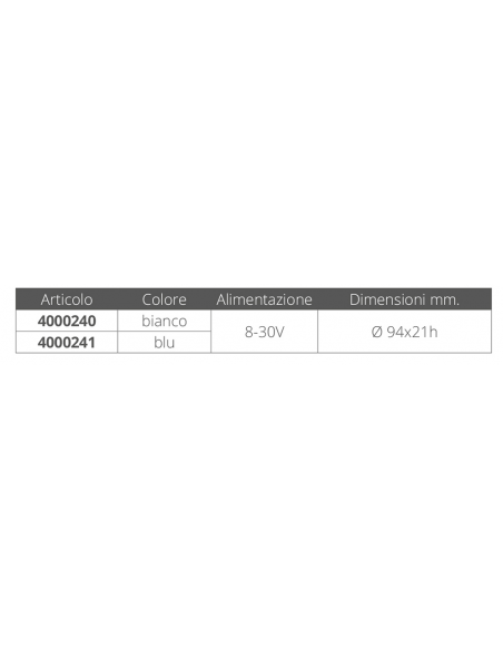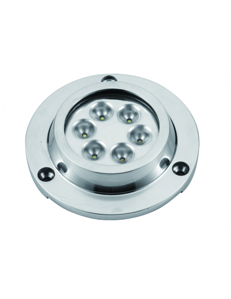Luce subacquea a led 6 x 3w, in acciaio inox aisi 316. luce fredda.montaggio a filo. alim. 8-30v 15w. durata 50000 ore.dim. ø mm. 94x21h.