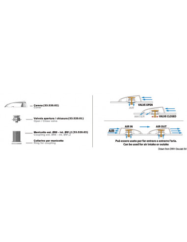 Corpo in ABS resistente al raggi UV. Si apre e si chiude dall'interno agendo sul pulsante centrale. Chiuso è perfettamente stagno. Consente sia l'entrata sia l'estrazione dell'aria.