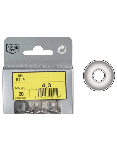 - Le rondelle piane con foro triplo DIN 9021 in acciaio inox A4 offrono eccellente resistenza alla corrosione, ideali per ambienti marini.