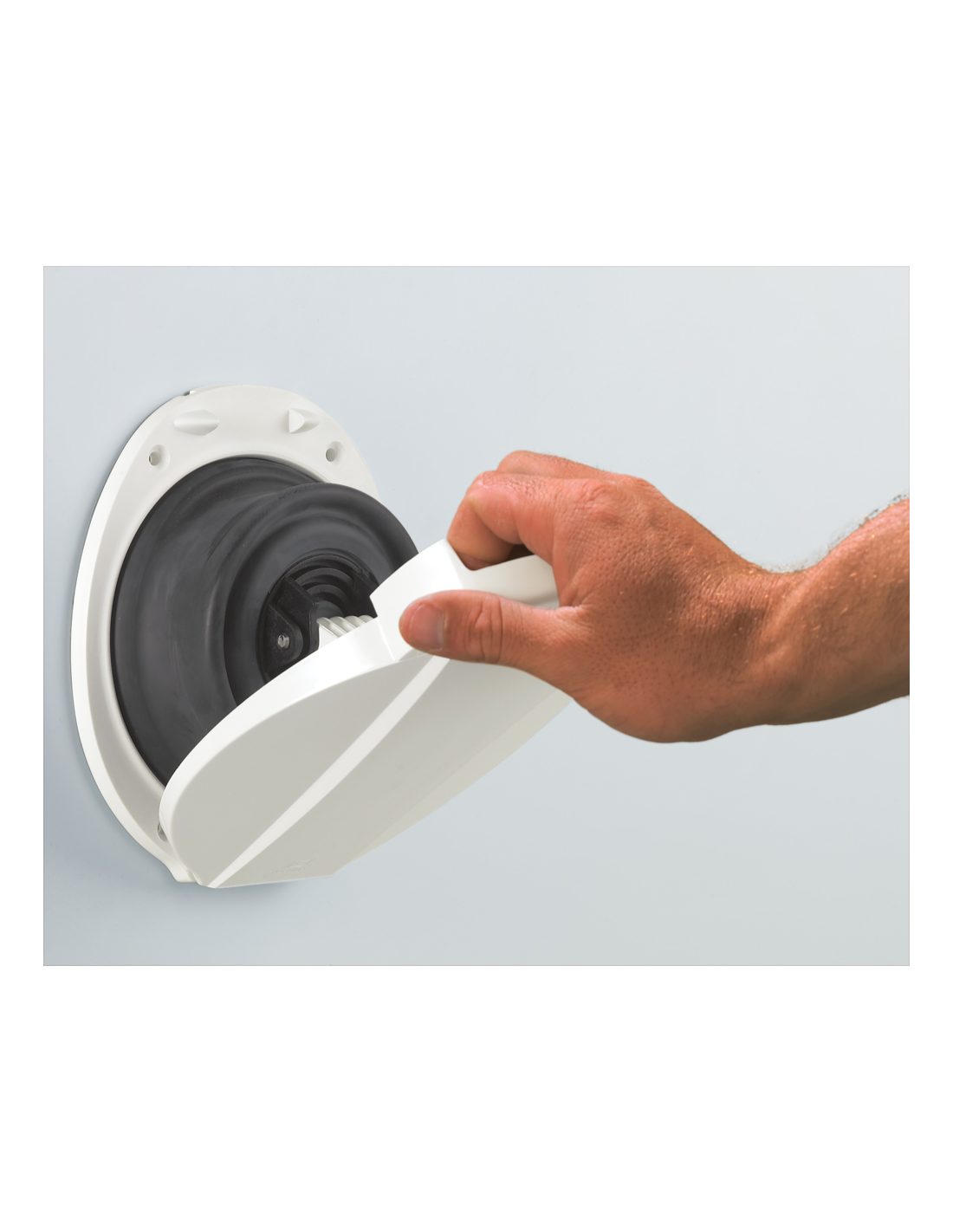 Pompa di sentina compatta con impugnatura integrata nel coperchio.