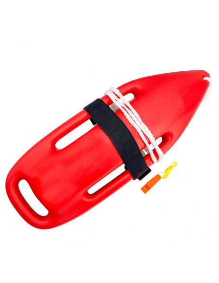 Kit di salvataggio composto da boa con cima galleggiante e cinghia di trasporto, fischietto di emergenza con laccetto.
