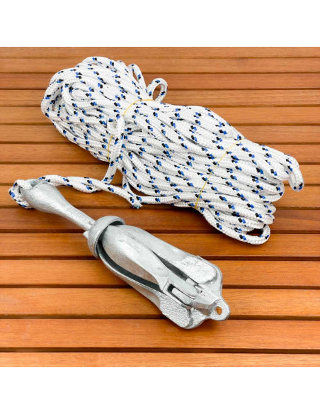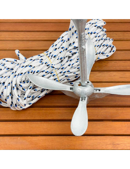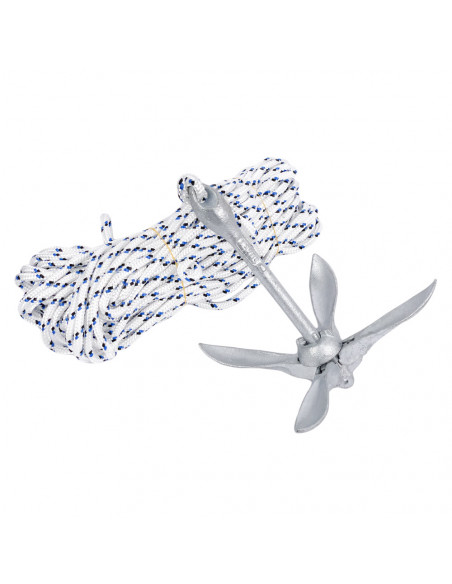 Set di ancoraggio, 2 in 1, composto da ancora con marre pieghevoli realizzata in acciaio fuso e zincato a caldo con ispessimento del fusto che funge da contrappeso e ne migliora il bilanciamento e cima in poliestere da 30 m.