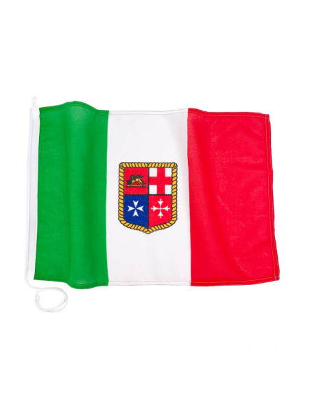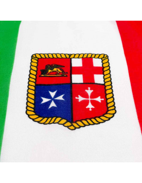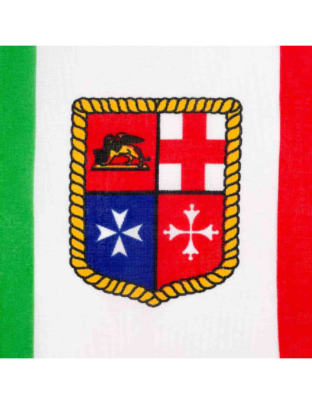 Bandiera dell’Italia con stemma su bianco della Marina Mercantile realizzata in stamina di poliestere.