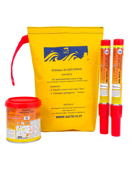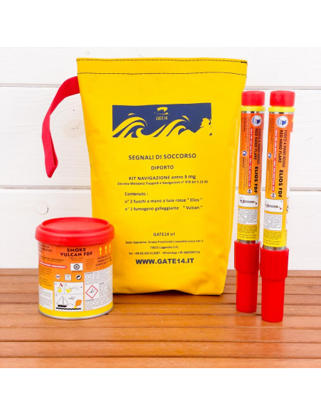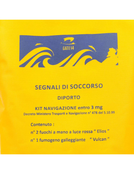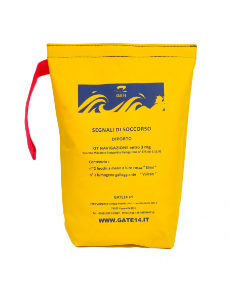Custodia idrorepellente di colore giallo, ad alta visibilità, contenente 2 fuochi a luce rossa e 1 fumogeno galleggiante, dotazione di bordo obbligatoria in Italia secondo la normativa vigente (DM n.
