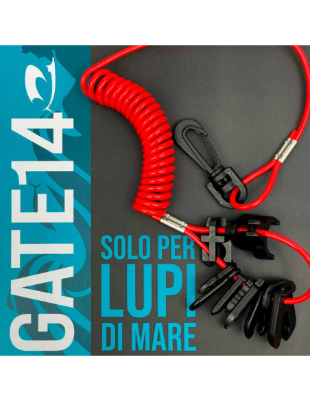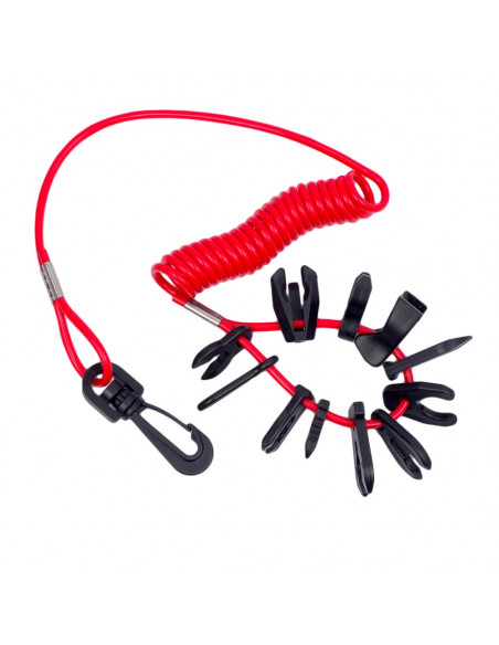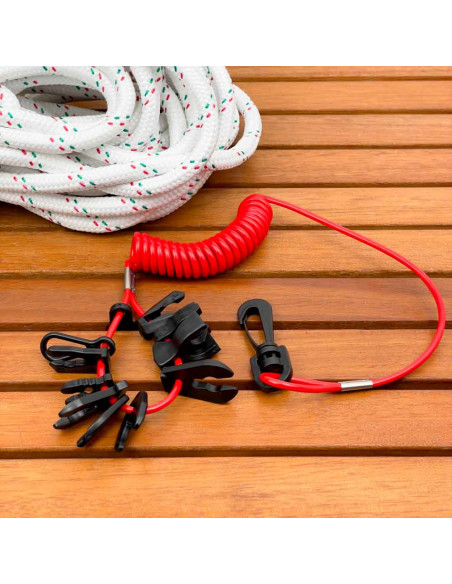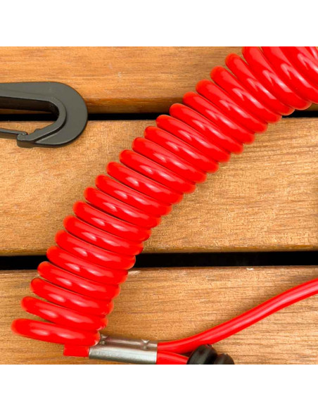 Facile utilizzo: legando il moschettone ad una polsiera o alla cintura, in caso di incidente o di caduta in mare, il laccio si tende finchè la forcella innestata nell’interruttore di spegnimento del fuoribordo si sgancia, arrestando immediatamente l’alimentazione del motore.