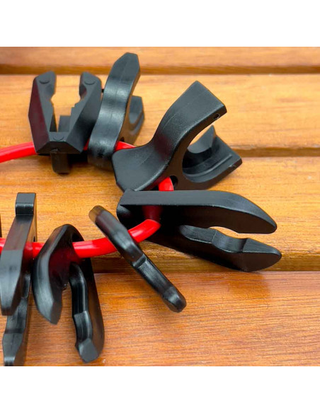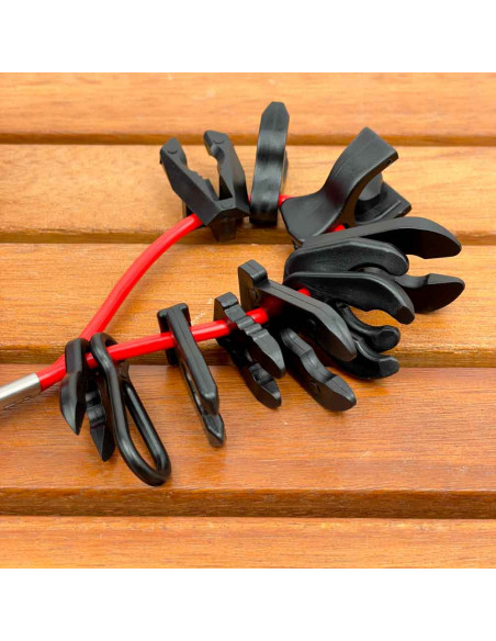 Kit composto da 11 spinette di sicurezza universali per fuoribordo con moschettone in plastica nero e laccio estensibile di colore rosso ad alta visibilità.