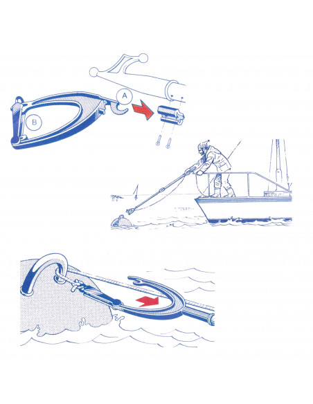 Applicazione intuitiva: il gancio speciale riesce a far passare le cime d’ormeggio attraverso l’occhiello del gavitello, boa, trappa o anello e riportare a bordo la cima; rende le manovre d’ormeggio più facili, veloci e sicure.