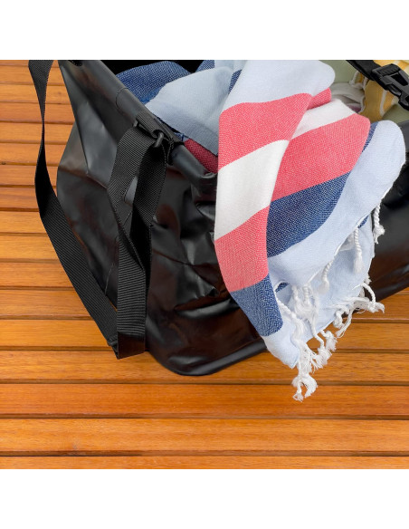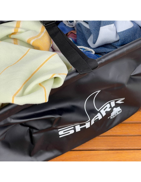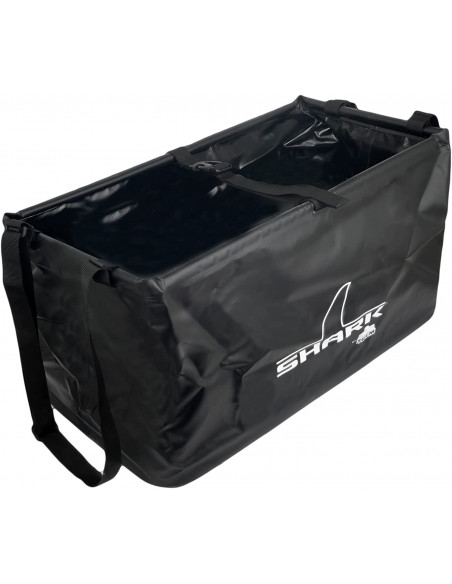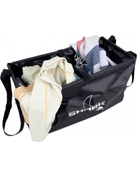 Catino comprimibile realizzato in PVC resistente con bordi rinforzati, maniglie e cinghie di contenimento.