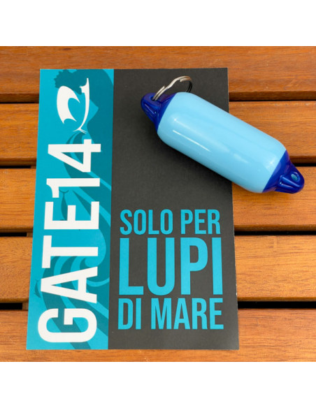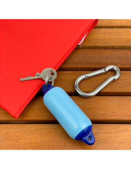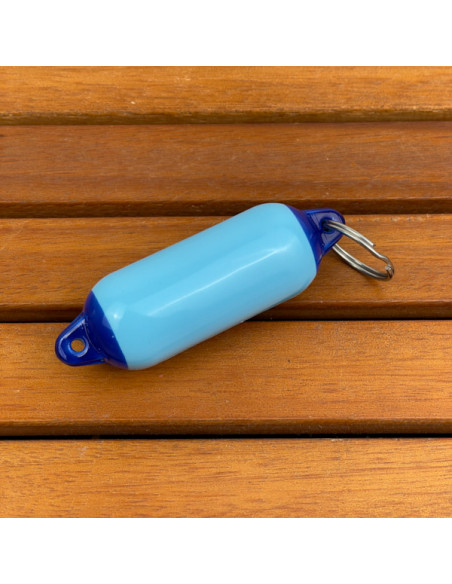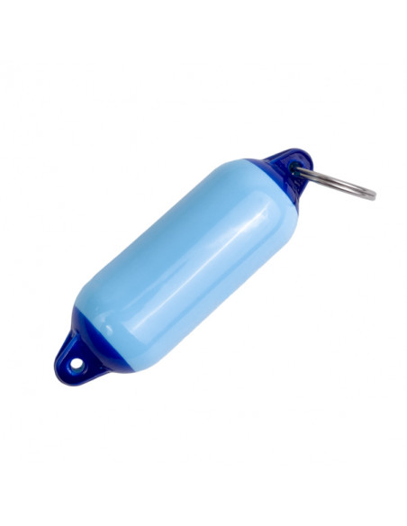 Portachiave a tema nautico in PVC morbido, di forma cilindrica, con corpo di colore azzurro ed estremità blu, anello in acciaio.