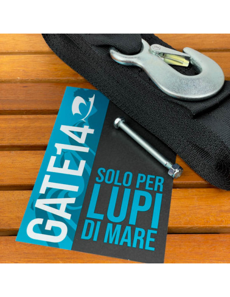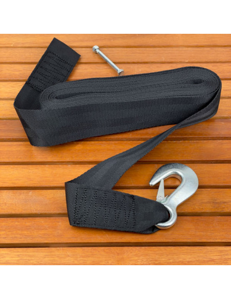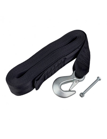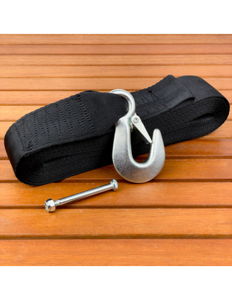 Nastro per verricelli a mano completo di moschettone e staffa di avvolgimento.