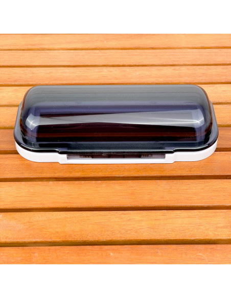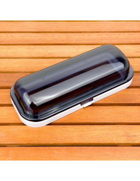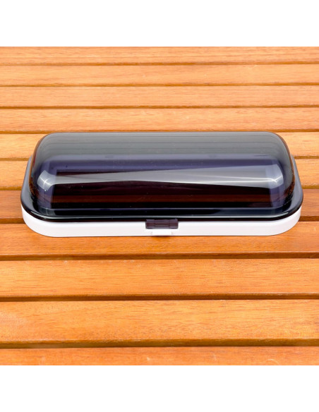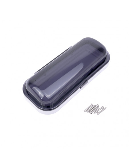 Corpo in plastica bianco e sportellino apribile con pulsante e molla flip-up grigio fumè.
