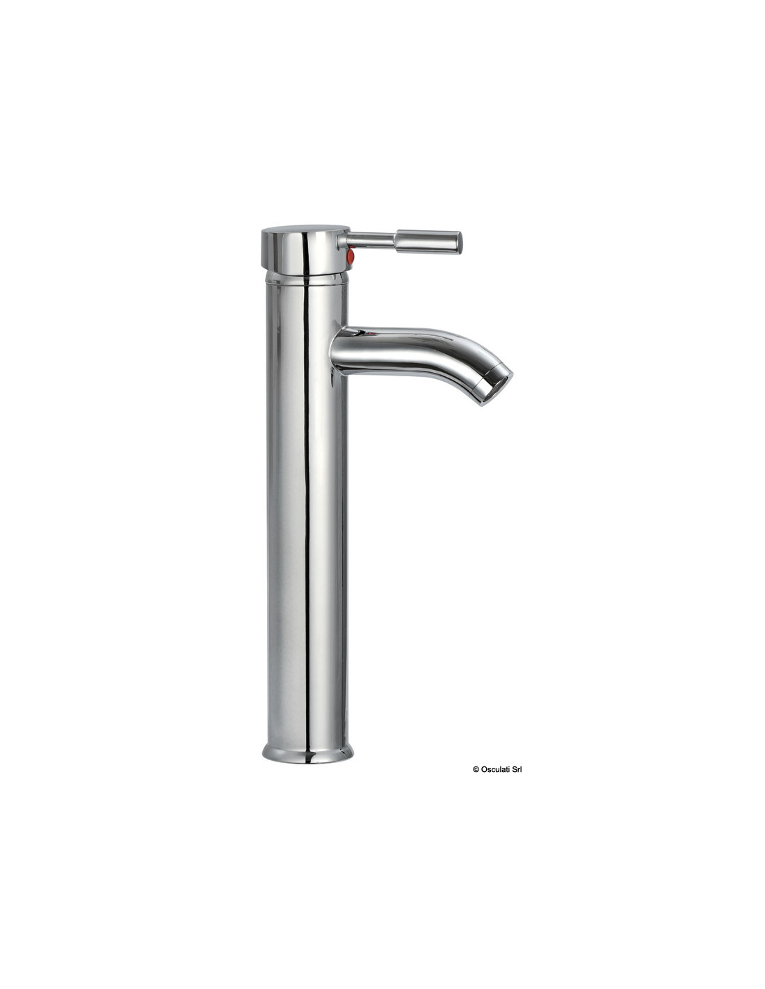 Rubinetto in ottone cromato. Da usare con lavabo sporgenti applicati sul piano.