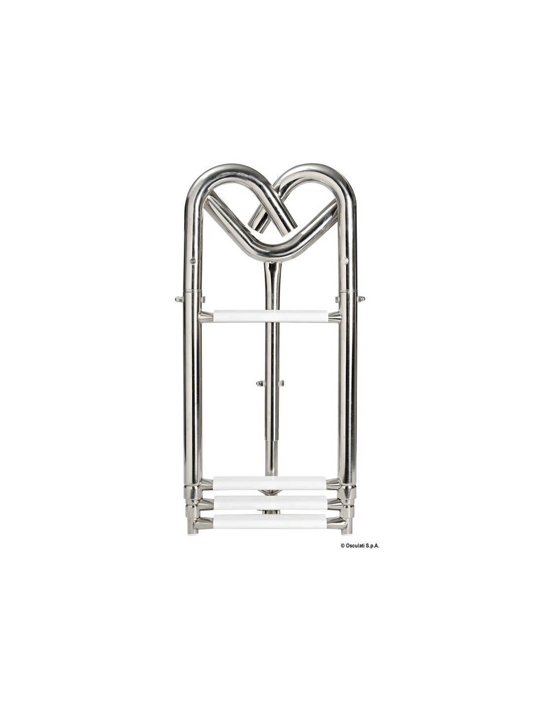 Realizzata in acciaio inox AISI 316 lucidato a specchio. I bracci sono girevoli e si agganciano al pulpito. Caratteristiche tecniche: scaletta telescopica con gradini ovali rivestiti in plastica bianca; bracci di aggancio girevoli; puntone di appoggio alla prua telescopico.