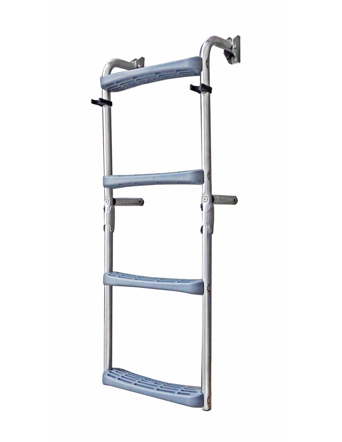 Scaletta pieghevolein acciaio inox AISI 316, Ø tubo mm 22, attacchi a 90° e gradini antiscivoloin plastica. Ideale per montaggio in verticale su specchi poppieri. Munitadi distanziatori fissi.