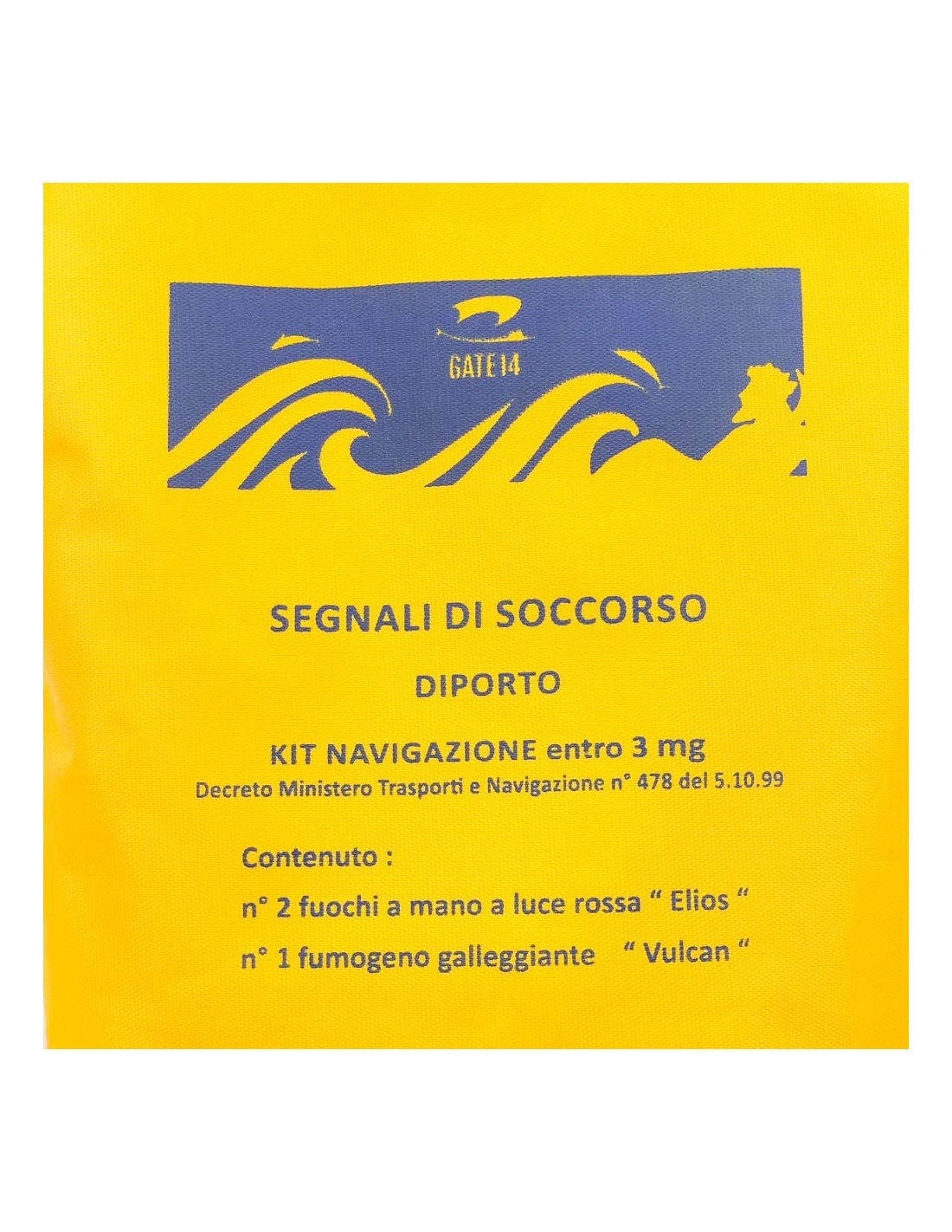 Custodia idrorepellente di colore giallo, ad alta visibilità, contenente 2 fuochi a luce rossa e 1 fumogeno galleggiante, dotazione di bordo obbligatoria in Italia secondo la normativa vigente (DM n.
