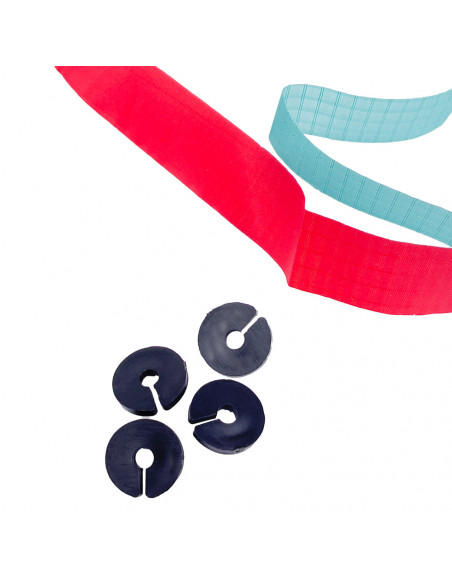 Accessori di fissaggio inclusi: rondelle in PVC e nastrini adesivi per montaggio su sartie, cime, cavi e sovrastrutture delle vele.
