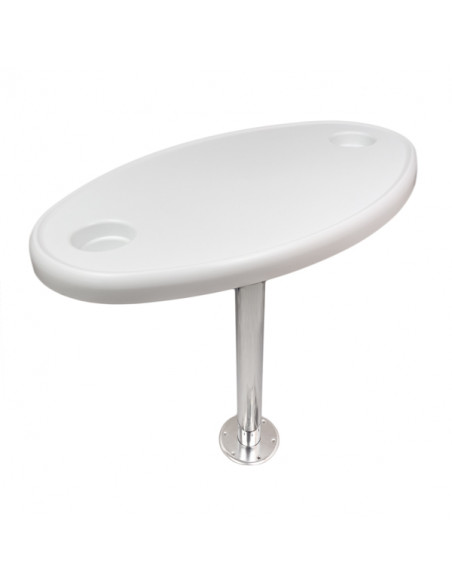 Tavolino di forma ovale in materiale plastico e supporto removibile in acciaio cromato con basi in alluminio pressofuso autobloccanti: una base si incassa nel pavimento mentre l’altra si fissa sotto il piano del tavolo.