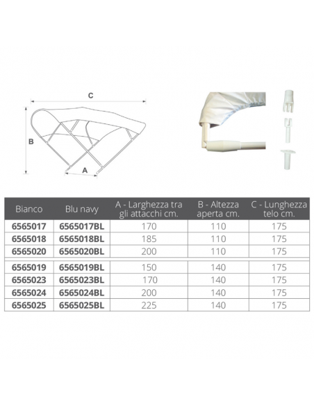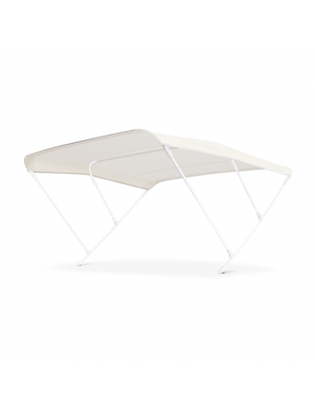 Capottina BIMINI para sole, para acqua. Telaio a 3 archi in lega leggera Ø mm. 20. Snodi in nylon, tessuto poliestere 100% spalmato in vinile. Universale per imbarcazioni in genere. Completa di ogni accessorio. Velocità massima di utilizzo 60 km/h.