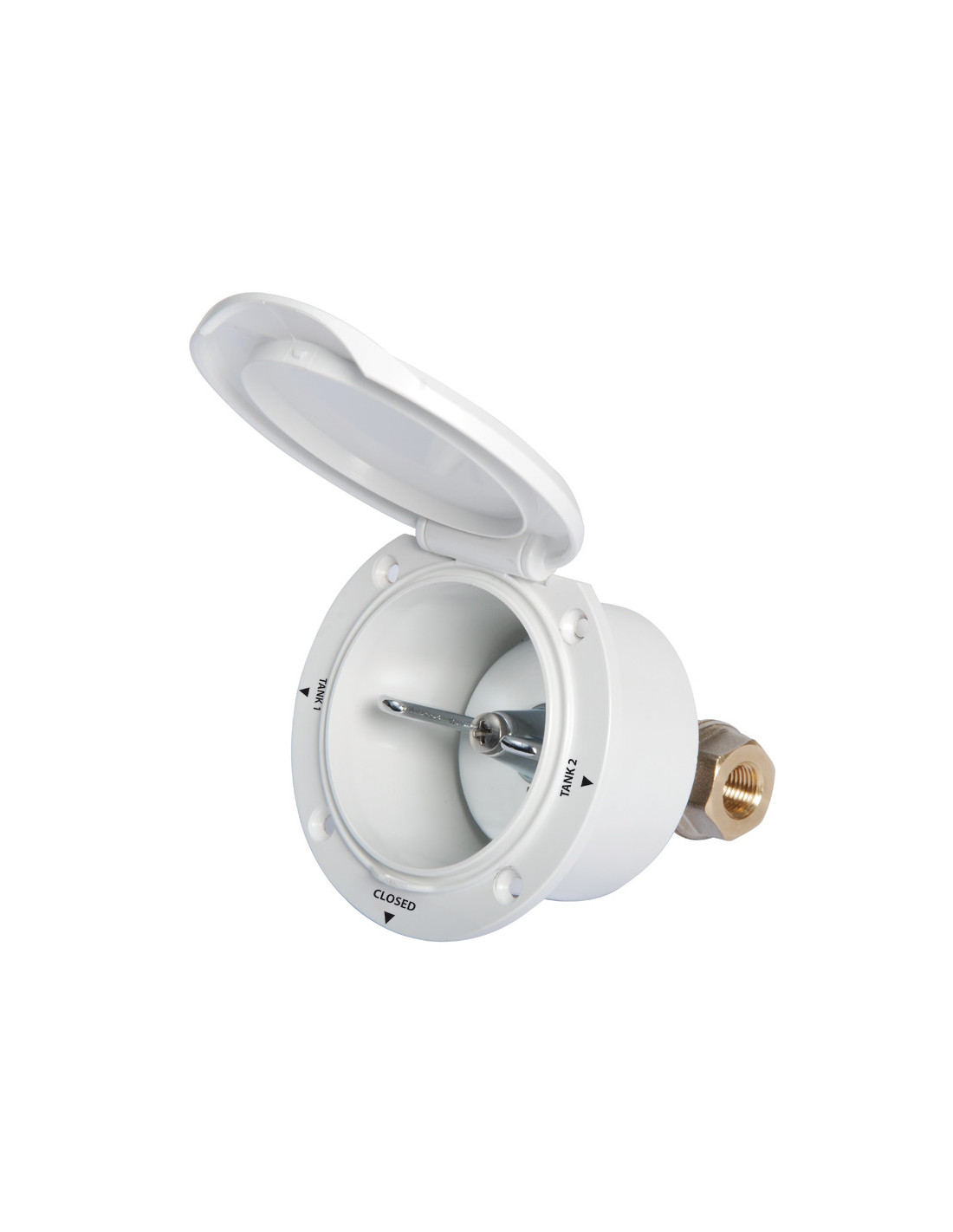 Rubinetto a 3 vie per collegare due serbatoi ad un motore. Tre posizioni tank 1 / tank 2 / chiuso.
